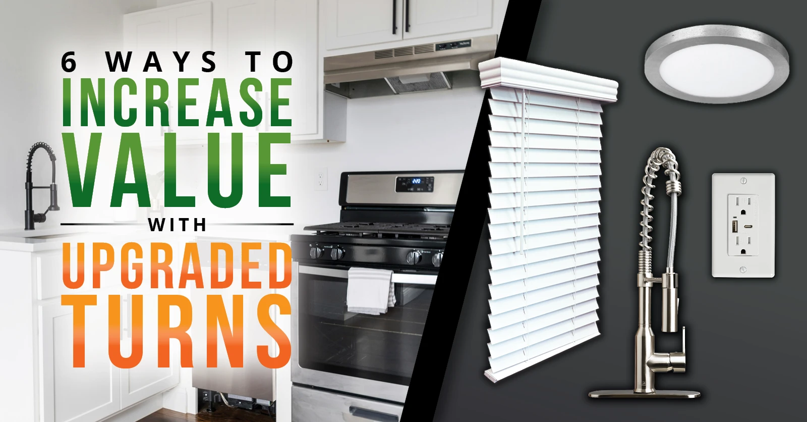 Patching and painting supplies, lighting kits, bulbs, plumbing fixtures (faucets/showerheads), pre-cut blinds, keys and locks, outlets/plates, alarms, and filters.
