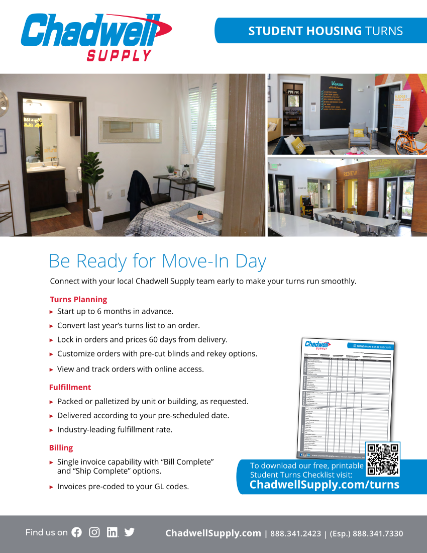 Choose Chadwell Supply for your next student housing turn. Move through turn season with less stress and fewer delays. Enjoy better outcomes for every student living community you manage.