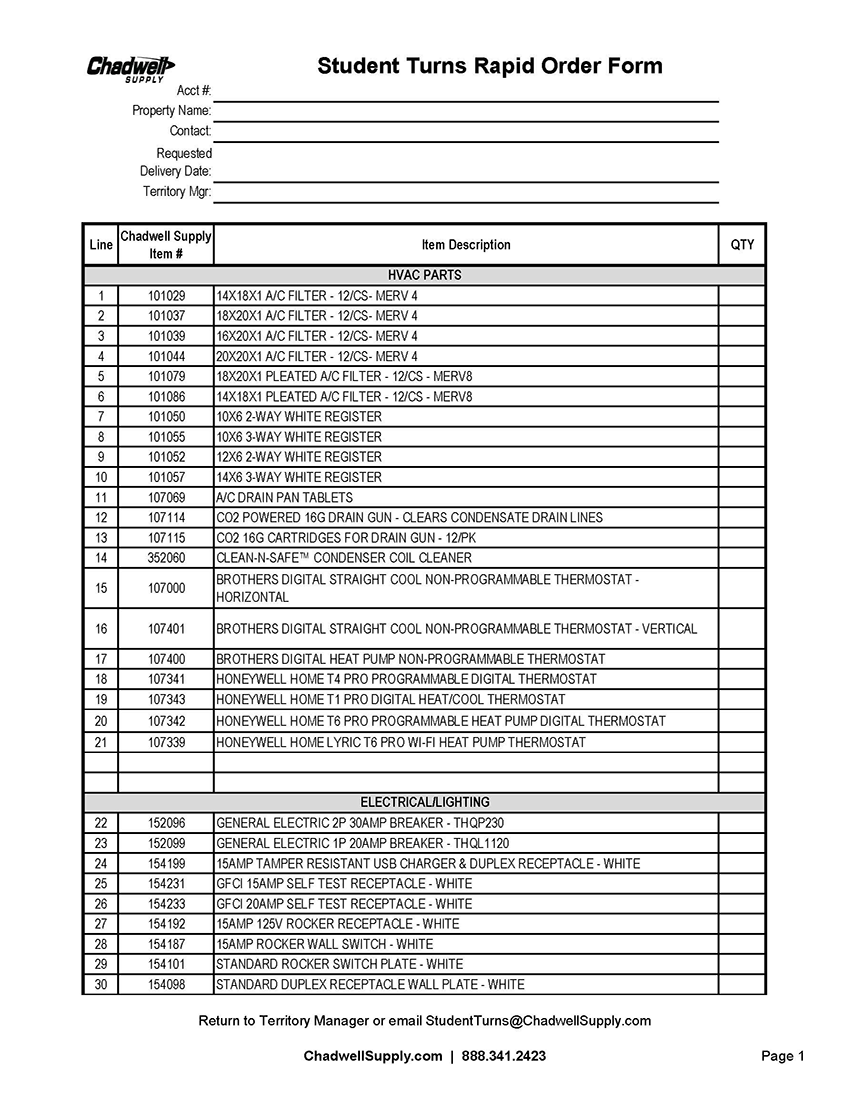 Turn last season’s order into a new quote—fast—with Chadwell Supply’s Rapid Order Form. Our student housing solutions help every student move stay on track across units and common areas—no guesswork.