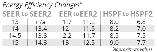 - SEER, EER, and HSPF terms are being replaced with SEER2, EER2, and HSPF2.