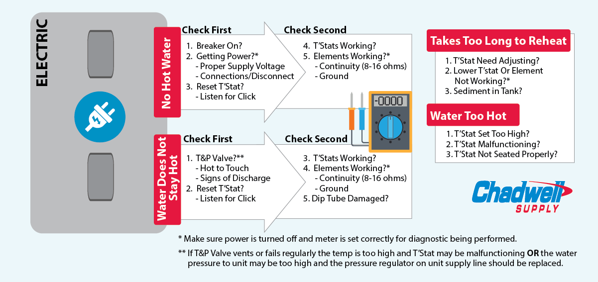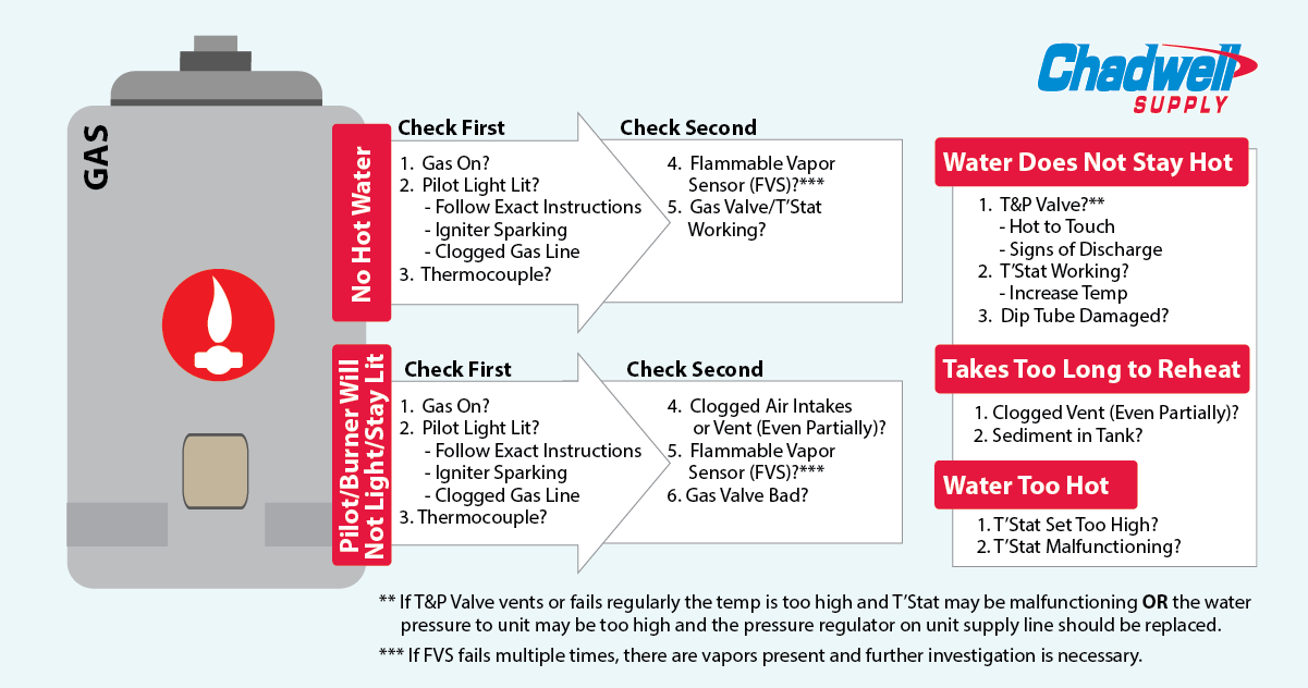 For more detailed instructions for troubleshooting and repairing both electric and gas water heaters, check out Home Repair Central. This site is written for homeowners, but the topics and information are helpful for multi-family maintenance too. (Note: clicking this link means you are about to leave chadwellsupply.com and go to a site that Chadwell Supply doesn’t control. Different privacy and security practices may apply.)