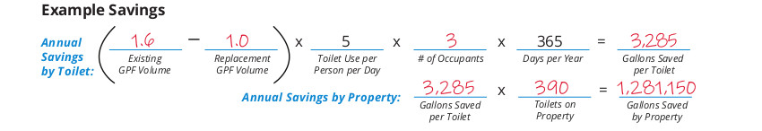 Use the calculator below to estimate annual potential water savings per toilet and by property. The results you see will be based on the following formula: