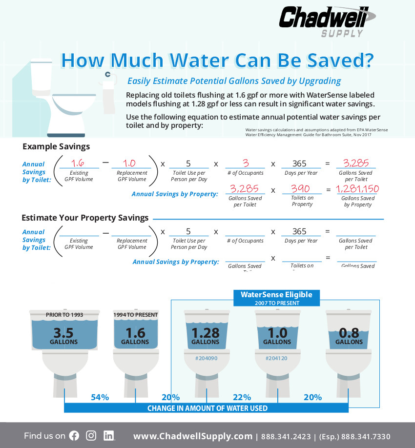 Water savings calculations and assumptions presented here are adapted from EPA WaterSense Water Efficiency Management Guide for Bathroom Suite, Nov. 2017.