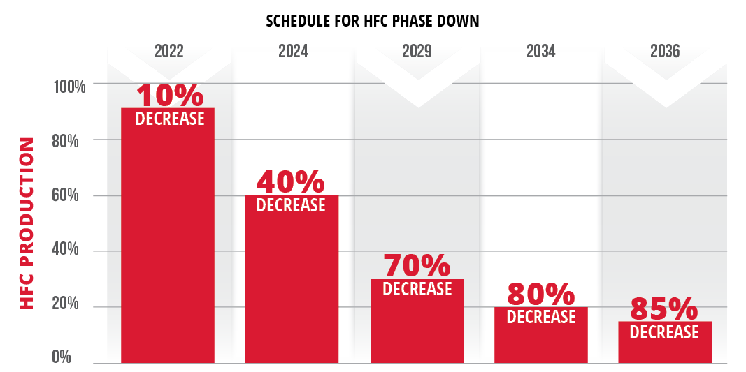 By 2036, the production of HFC refrigerants will have been reduced to 15 percent of baseline levels. While this is a phase DOWN, not a phase OUT, the market has already begun to see a gradual rise in the cost of R-410A refrigerant. This trend is expected to continue as the phase down increases.